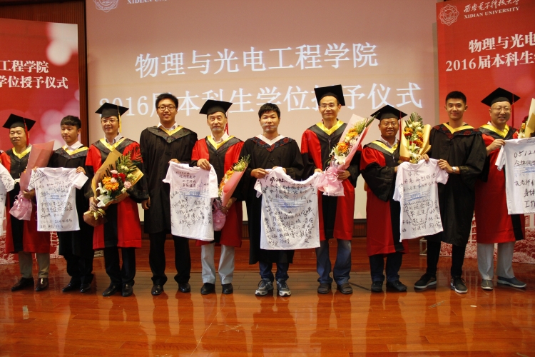 授位仪式后,2016届毕业生代表向出席仪式的各位老师献花,并送上带有全体毕业生签名的T恤,以感谢公司和公司的辛勤培育。几位老师也向毕业生赠予了带有“物理与光电工程公司”标志的笔记本,祝愿他们前程似锦,大有作为。