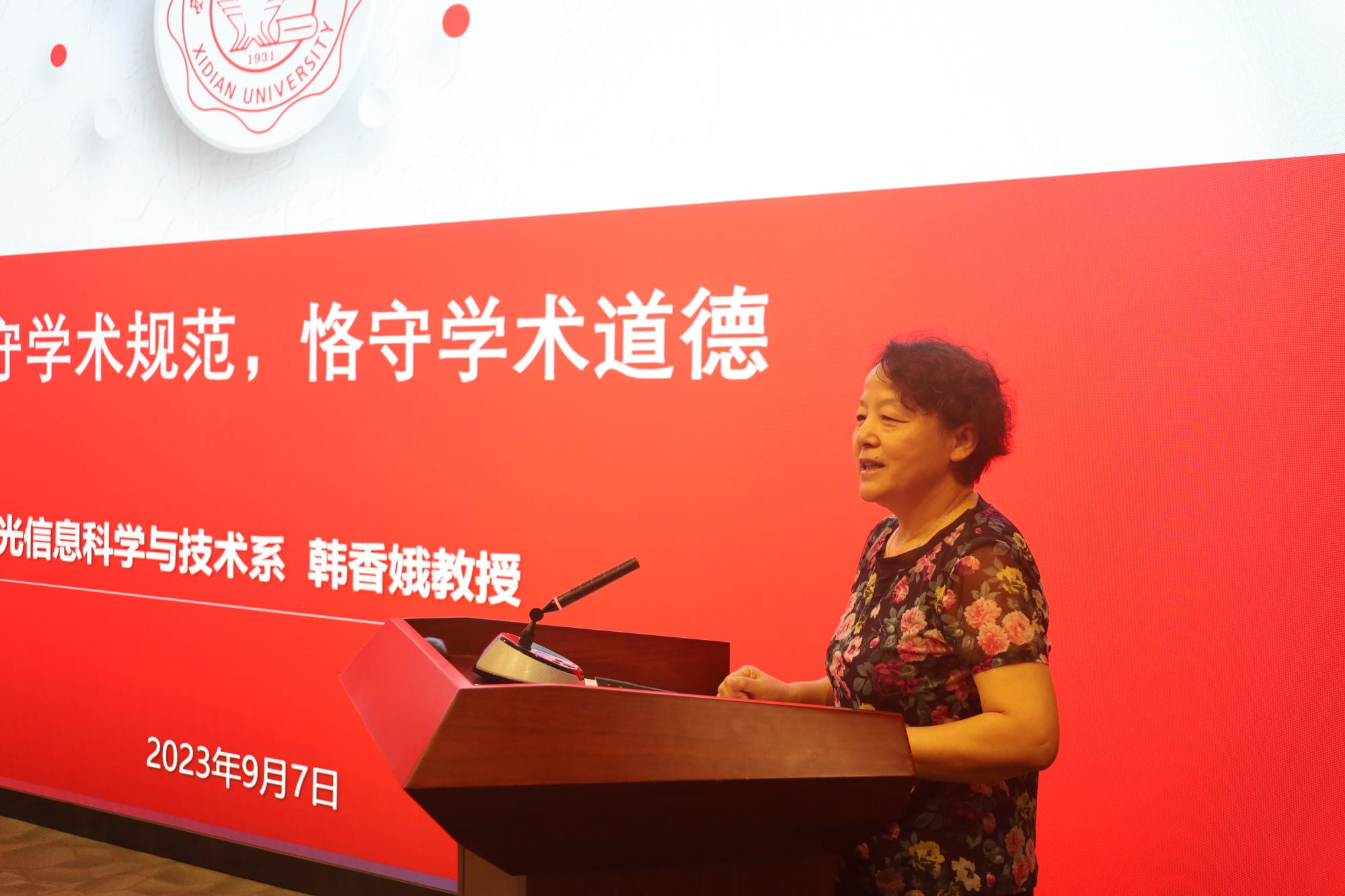 随后,魏兵向新生介绍了公司产品情况及要求,希望新生同学能够迅速完成角色转变,尽早适应研究生生活。导师代表韩香娥教授向同学们开展了学术道德及学风建设培训,她介绍了学术道德相关要求以及公司相关文件规定,并以西电物理学科创始人王一平教授、物理实验奠基人胡昌璧教授的先进事迹,展现在科学研究中一丝不苟、刻苦钻研的精神,希望同学们能够向老一辈科学家学习,传承科学家精神、潜心科学研究。