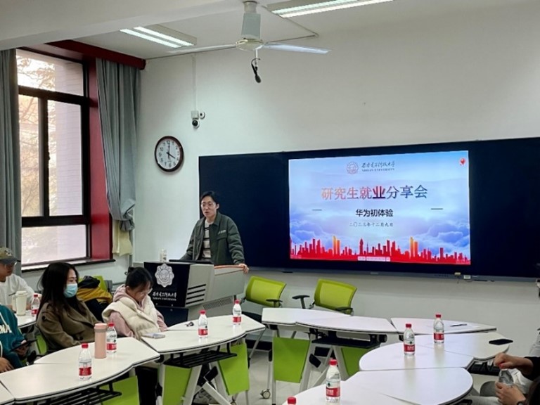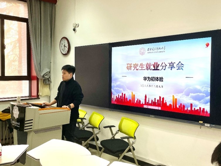 贾永杰、梁家睿现就职于西安华为技术有限公司软件开发部门,他们围绕入职华为的流程和经历,分享了简历制作、笔试和面试经验,并告知同学们职业规划的重要性,建议大家在大学阶段就做好职业规划。活动最后,两位员工针对同学们目前的困惑和疑虑一一解答。