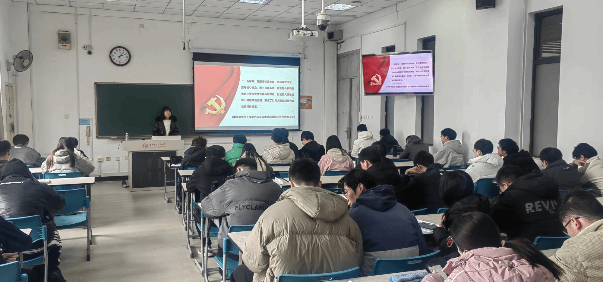车纯以“不忘初心,走好新时代赶考路”为主题进行了党课讲授,从“中国共产党百年发展史的辉煌成就”“共产党赶考之路的起点西柏坡”“走好新时代‘赶考’路”三个部分梳理了中国共产党的发展历程。他讲到,习近平总书记的重要讲话指出了西柏坡的独特定位和时代价值,强调党面临的“赶考”之路远未结束,因此作为新时代青年要不忘初心、牢记使命,务必谦虚谨慎、艰苦奋斗,锲而不舍实现既定目标,务必敢于斗争、善于斗争,有效应对重大风险挑战。他总结道,中国共产党的“赶考”精神与时俱进,在新时代的赶考路上,年轻一代要做好新时代的答卷人。