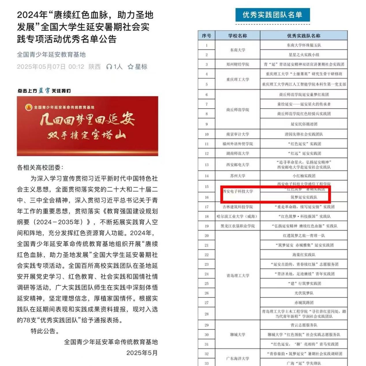 (通讯员 杨展)近日,2024年“赓续红色血脉,助力圣地发展”全国老员工延安暑期社会实践专项活动优秀名单公布,太阳成集团tyc“筑梦延安”实践队入选全国优秀实践团队。