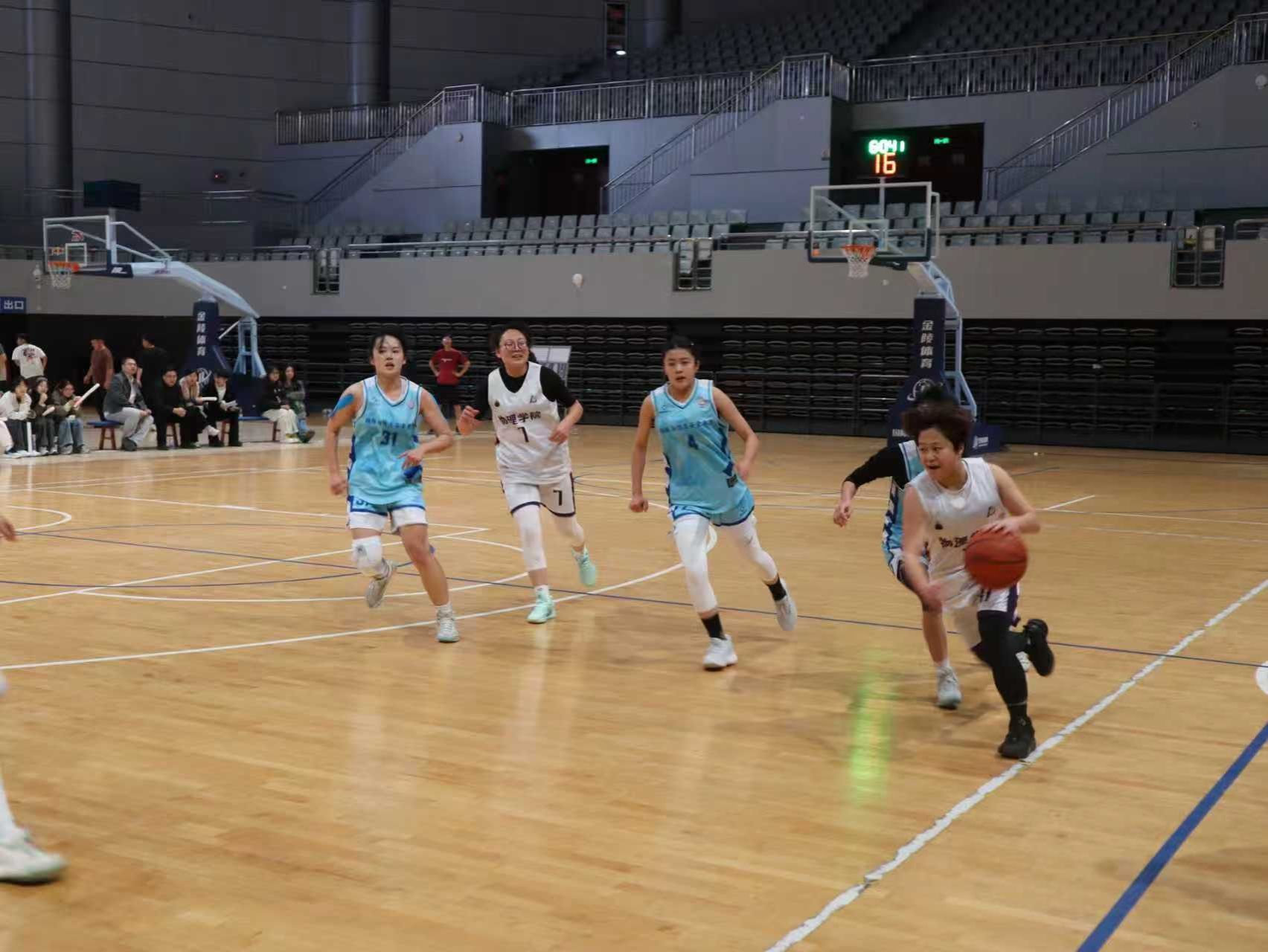 女子组篮球赛决赛现场,每一次攻防都牵动人心。物院女篮的姑娘们,眼中有光,心中有火。进攻端,她们如水银泻地,行云流水的配合撕开层层防线;防守端,她们似铜墙铁壁,寸土不让的坚守彰显顽强意志。双方比分胶着,战况激烈,公司主力队员陈美洁遭遇崴脚,仅短暂休息后,坚持绑好绷带继续带伤比赛,队员们也被她的斗志所影响,将平日的千锤百炼,化作赛场上每一次果决的出手与奋不顾身的扑救。41:44,当决赛的记分牌定格,现场观众爆发震耳欲聋的掌声为双方队员的拼搏体育精神喝彩,三分之差,是物院女篮与冠军擦肩而过的遗憾,更是她们虽败犹荣、赢得全场的勋章。